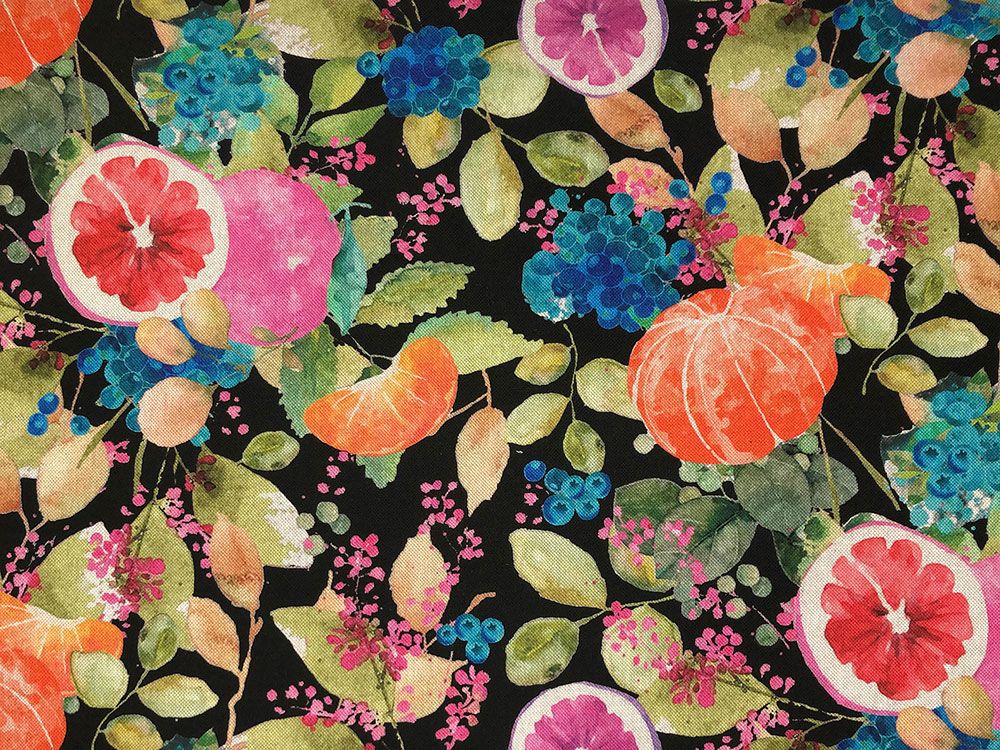 Linen Look Printed Panama Fruit Garden, Black is available to buy in increments of 0.25